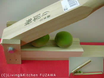| 梅を潰して漬け込むという一風変わった漬け込み方ですが、 赤紫蘇の風味豊かでおいしいそうです。 私も今年試してみようかと思っているレシピですので、 分量(塩分等)はご参考までにという量です。 氷砂糖を使う事も出きるそうですので、お子さまにも良いかな(^-^)    「写真」 山梨産 甲州最小  「写真」 長野産 竜峡小梅 カリカリ梅を作る際、何よりも大事なことは”鮮度”です。 青くて堅い梅でないと、うまく漬かりません。 荻窪 鈴木青果店では、カリカリ梅用の梅の通販を承っておりません。 直接ご来店頂けるお客様につきましては、ご注文を承っておりますが、 その他地域にお住まいの方は、恐れ入りますが、 ご近所の野菜のプロ”八百屋”さんにご注文ください。 入荷日を聞いて、その日に漬け込み。これが「カリカリ」の食感を楽しむ秘訣です。 ○ 材 料 ・ 用 具 ・ 小梅〜中ぐらいの梅 1kg(大きさ・品種はお好みで) ・ 卵の殻(卵2個分) ・ 塩150g(15%〜お好みで増やすのは可) + 赤紫蘇塩もみ用(適量) ・ 赤紫蘇 1束(色よく漬ける場合は2束) ・ 甘めに仕上げるには氷砂糖を使います(塩の分量と同量) ・ 樽もしくはタッパー ・ 重石2kg(梅の2倍の重石) 冷蔵庫に入れて作る場合は 金魚鉢に入れる小石を夏みかんなどが入っているネットに入れて使うのが おすすめだそうです。落としぶたもいりません。ちょっとした知恵袋ですね(^-^) ・ 卵の殻を入れるガーゼ ・ きべら(しゃもじ) ○ つくりかた まず最初に卵の殻を用意します。卵の殻を使うことによって、 梅が柔らかくなるのを防ぎ、カリカリになります。 ※なんで卵の殻を使うの? 梅に含まれている「ペクチン」 卵の殻は、内側に付いている薄皮をきれいに剥がして、水洗い。 その後、天日によくあて、乾かします。 1〜2日干して、カラカラになったものを砕いて、ガーゼに包んで使います。 卵の殻の準備を始めたら、八百屋さんに小梅を注文してください。 鮮度が大事ですので、青くて堅いものを注文してください。 青くて堅い梅を入手したら、いよいよ漬け込み作業に入ります。 お洗濯等、お忙しいとは思いますが、梅優先でお願いいたします。 梅の下ごしらえ まず最初に、水の中でころがしながら、小梅を洗い、 たっぷりのお水につけて、半日(6時間程度)灰汁抜きをします。 灰汁抜きが終わって、水からあげる際もころころところがしてください。 へたの部分が簡単に取れると思います。 次に赤紫蘇を塩もみして、灰汁だしをします 梅を乾かしている間に作業します。 赤紫蘇の葉を茎からむしって、 よく水で洗う。(ドロはしっかり落ちましたか?) ボールに葉を入れて塩をふり、しんなりするまで、そのまま置いておく。 (5〜10分程度でOKです) 葉がしんなりしたら、強く押しながら両手でもむ。 黒いアク汁がでたら、水気を絞って汁を捨てる。これでOK。 梅の種取りをします 水からあげた梅をざるなどにとり、水気をよーくきります。 キッチンペーパーなどで、水気をきるのもOKです。 (カビの原因になりますので、水気は十分きってください) ちょっと普通のレシピと違う点はここの部分です。 まな板の上できべらを使って、梅を潰しながら種を取り除きます。 金属製の道具は一切使わないようにしてくださいね。 全ての梅を潰し終わったら、漬け込み作業に入ります。 ○ 秘密兵器発見! フザワさん情報ありがとうございます ( ^ - ^ )/ こういった便利な道具があるんですね。 今年初めて知りました。  「写真」 梅割り 写真提供 : 上井草リビング&キッチン フザワ さん 「梅割り」という道具だそうです。 サイズは 長さ50cm 幅7.5cm 高さ6.5cm(柄を使うと31cm) 大量に漬ける場合、さすがに一粒一粒潰して種を取るのって たいへんだから、そんな時に”もってこい”の道具ですね。 梅の漬け込み 普通の梅干しを作る時と同様に、漬け樽の底に軽く塩をふります。 次に漬け込み作業に入りますが、ここもちょっと違います。 先ほど塩もみしました赤紫蘇を指で広げ、先ほどの潰した梅をくるむようにします。 このくるむ作業を繰り返しながら、樽に一並べ。そして塩をふります。 氷砂糖を使う場合は、塩と一緒に入れます。 くるんで、並べて、塩をふって。 この作業の繰り返しで真ん中まで来たら、 ここで用意しておいた、ガーゼに卵の殻をくるんで入れます。 その後は同様に、 「くるんで、並べて、塩をふって」を繰り返してください。 (上に行くにしたがって、塩の分量を増やしてください) 最後に、重石をのせます。 ここまでで、第一段階終了!おつかれさまでした(^-^) 冷暗所が無いお宅では、冷蔵庫に保存してくださいませ。 ※このレシピを掲載した当時(6年前)と比べると、最近のご家庭は、 機密性が高く、梅にとって暑すぎる場合もあるようですので追記しました(2009/06)。 でも、ここからが一番気を使います 梅酢が上がってくるまで、早くても3日程かかります。 毎日1〜2回、重石と落としぶたを取って、 平均的にお塩がまわるように、容器をあ